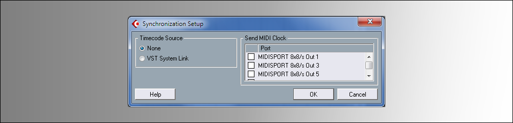 Also, Synchronization Setup should be checked if Cubase does not sent MIDI clock to our MIDISPORT Port 1: