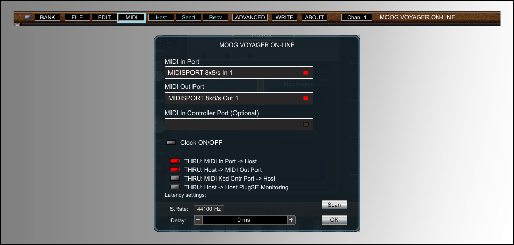 Here you can manually set MIDI In and Out ports and configure other MIDI routings. The Scan button runs the same MIDI port scan as when the PlugSE was started.