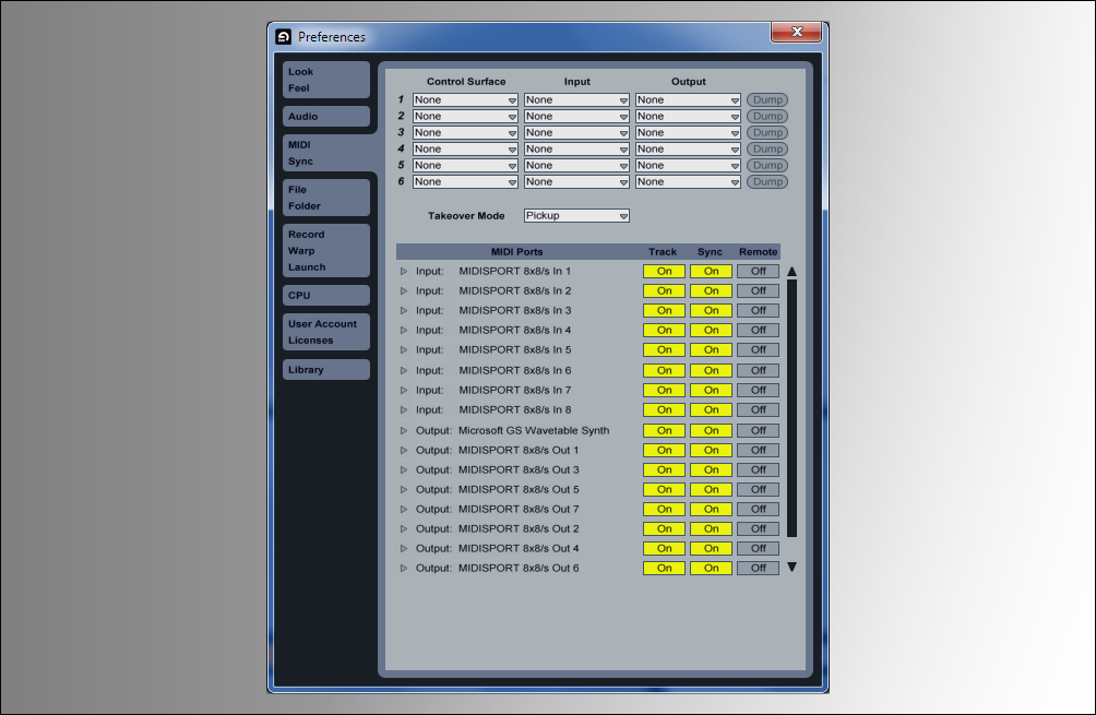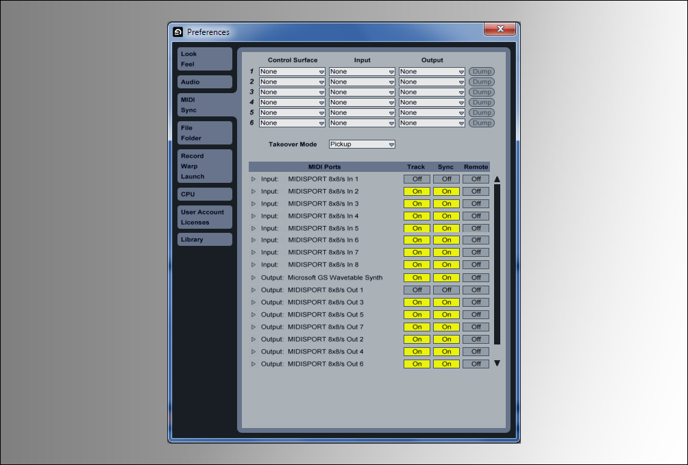 In the example below, we have our Voyager connected to MIDISPORT 8x8 ports 1 IN and OUT . We want to make sure that Ableton Live does not access those ports so we need to deactivate them.