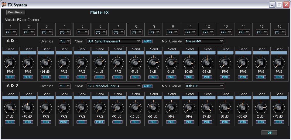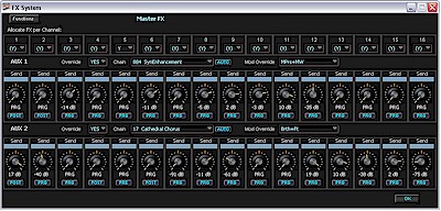 A Master FX window provides a global view and control of the effect assignments on all 16 MIDI channels.