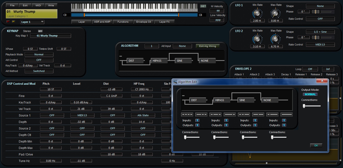 Every Program Layer can have 2 stereo keymaps (multisamples) assigned and routed through different DSP Algorithms and effects. Layers have their own sound envelopes, LFO’s, modulations and many other sound parameters.
