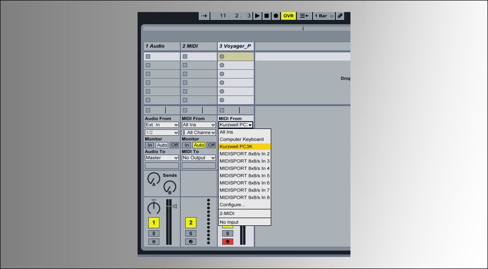 If you like to like to play notes through the PlugSE using your external keyboard controller, you may have to make proper settings in Ableton Live to route MIDI signals to the PlugSE. In our setup we selected Kurzweil PC3K keyboard.