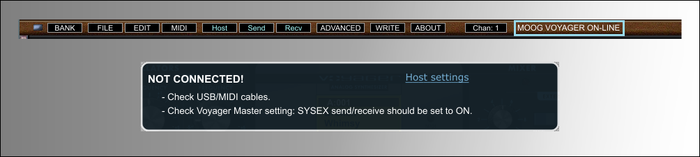 Start the Voyager PlugSE, the PlugSE will automatically search for the Voyager on all available ports. If everything is set up correctly, you should notice the “MOOG VOYAGER ON LINE” message. If not, a warning message will inform you about incorrect Voyager Global settings.