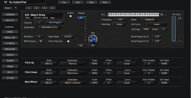Through a standard MIDI connection (DIN or USB), Sound Editor can receive and transmit individual Programs, Multi, Effects, or entire banks to the PC4.