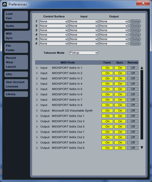 In the example below, we have our Mopho connected to MIDISPORT 8x8 ports 1 IN and OUT . We want to make sure that Ableton Live does not access those ports so we need to deactivate them.