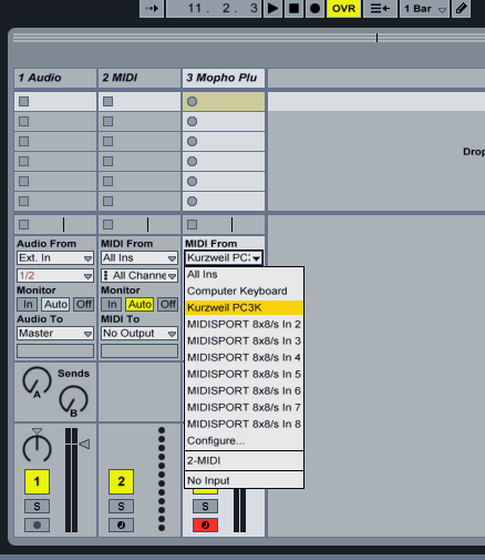If you like to play notes through the PlugSE using your external keyboard controller, you may have to make proper settings in Ableton Live to route MIDI signals to the PlugSE. In our setup we selected Kurzweil PC3K keyboard.