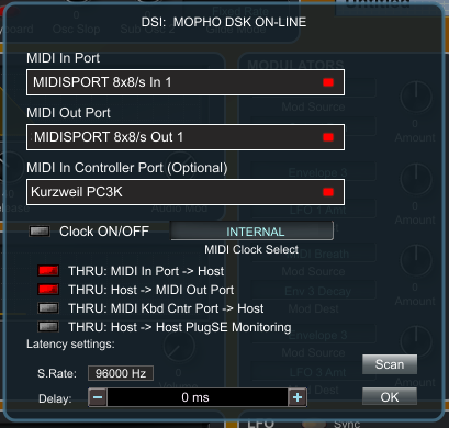 Here you can manually set MIDI In and Out ports and configure other MIDI routings. The Scan button runs the same MIDI port scan as when the PlugSE was started.