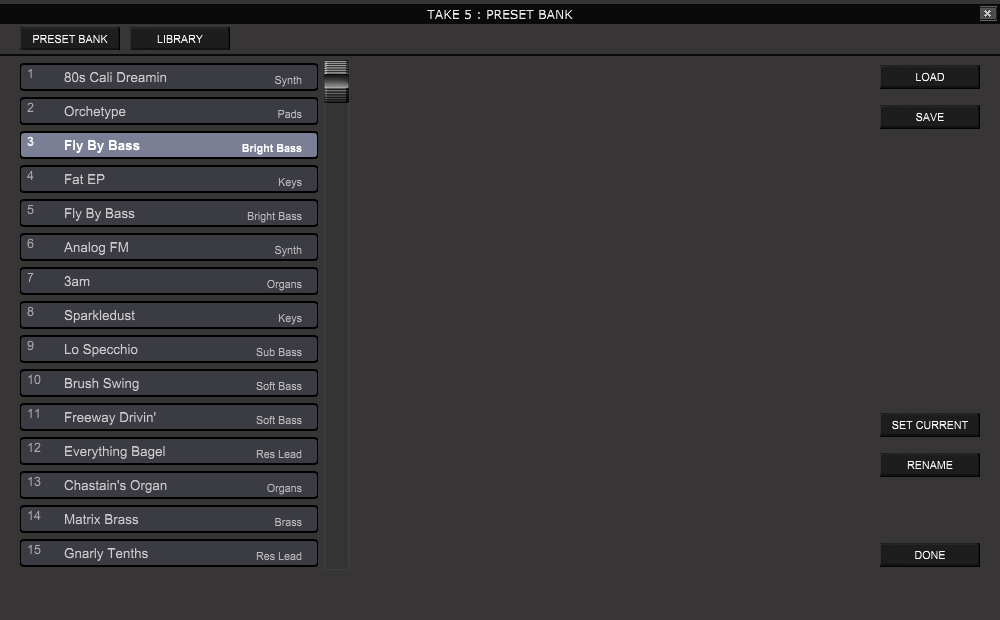 The PlugSE’s preset bank comes preloaded with programs from the TAKE 5 Factory Bank 1 and therefor may look similar to TAKE 5 internal bank.