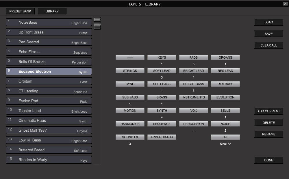 The Librarian Mode provides an easy access to TAKE 5 librarian files where programs are organized and saved according to their assigned sound category. To switch to Librarian Mode click on the LIBRARY button. There are about category 26 buttons under each the number of programs in that particular category is displayed.