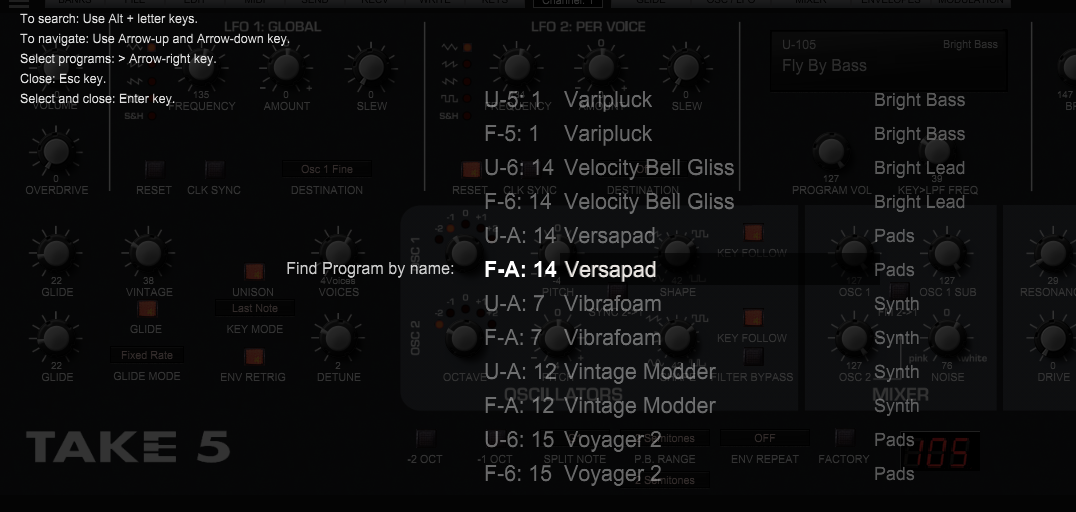 You can select User or Factory programs using the Bank Panel and also by typing first letters or names or program numbers.