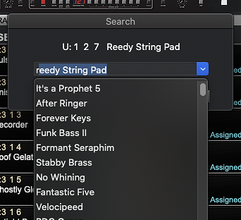 The SEARCH button (CNTR+F) brings up the Program Search where you can search for programs in all Prophet~5 banks.