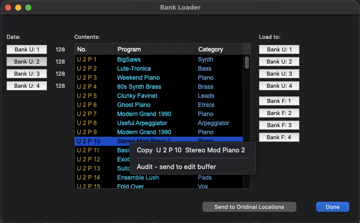 When loading any files that contain more than one program, for example bank files or All Data files, you will be presented with the Bank Loader window.
