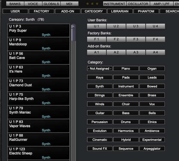 The Banks Panel view lets you see all User and Factory program banks where you can select Programs for editing or audition.