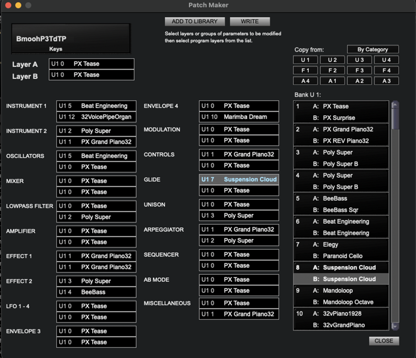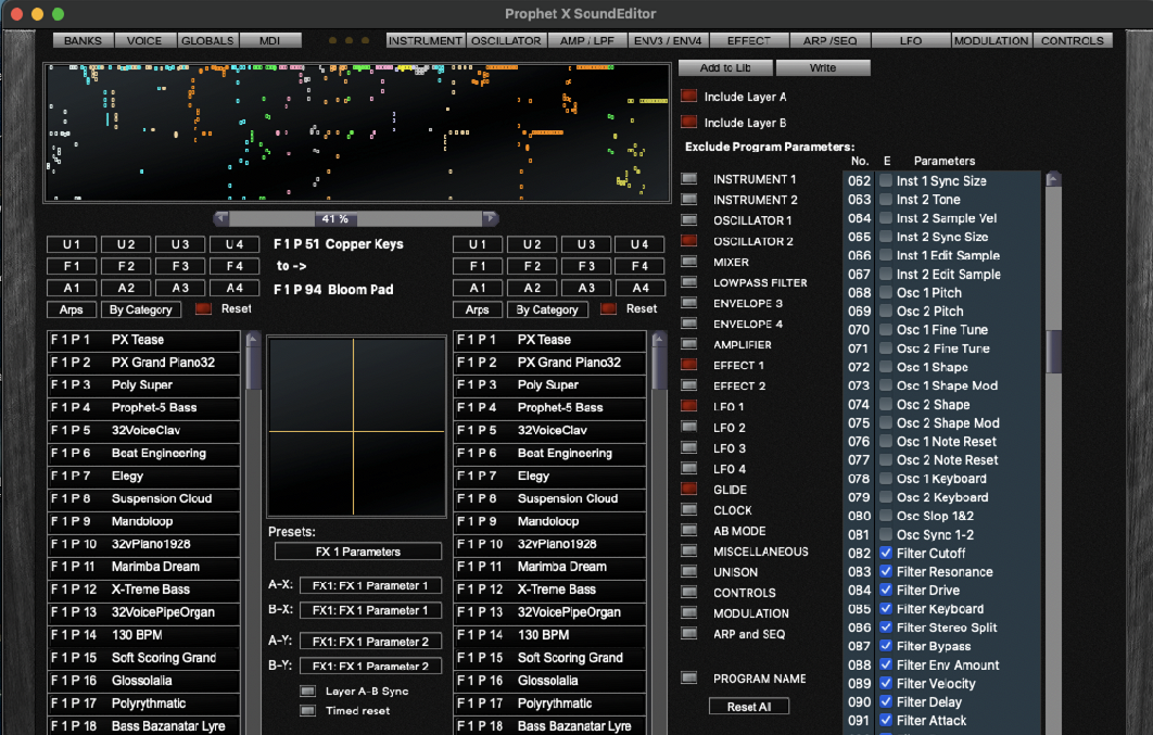 Similarly to the Morph function in the Program Genetic, patches are created by linearly interpolate parameters from a selected program from the list on the left to a selected programs from the list on the right.