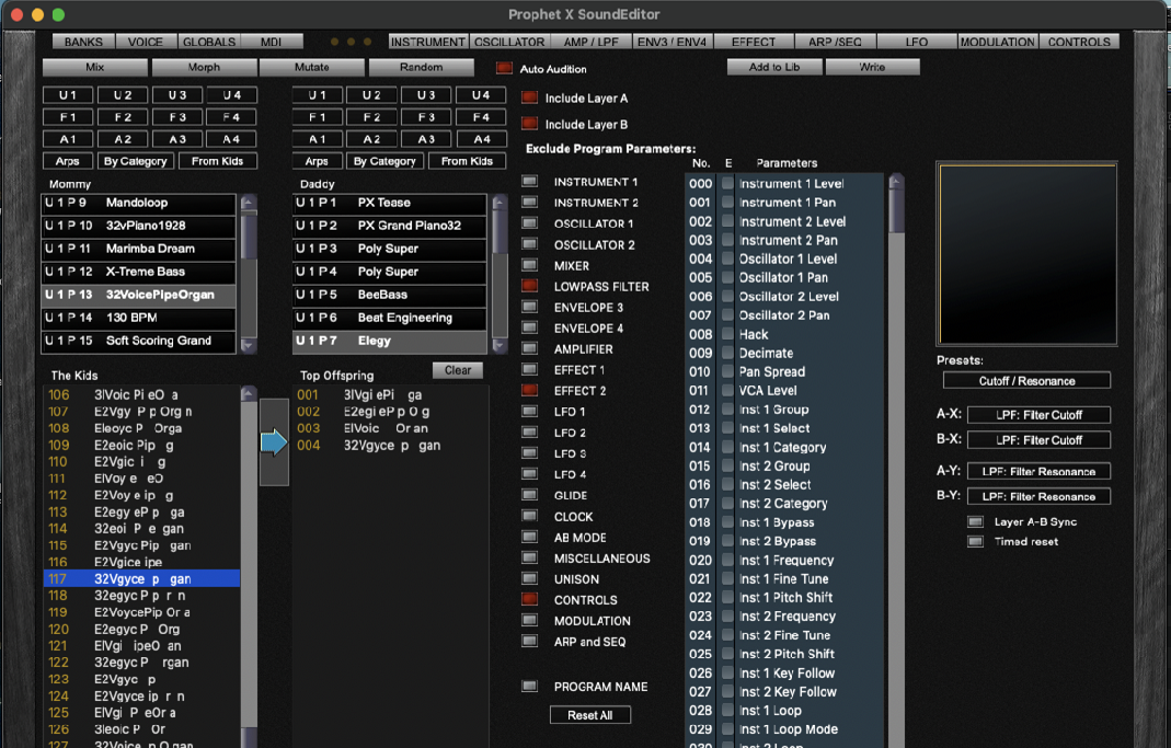 Experimentation using vastly different parents or similar parents creates the most interesting results. You can also ‘interbreed’ the child patches, too. In addition, you can set filters to excluded parameters that will not take a part in the generation of new offspring. Experiment and have fun