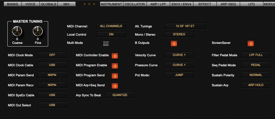 The Prophet X Globals (Control+G) can also be found under the MIDI window menu. Please note that some settings that are necessary for maintaining a proper MIDI communication are disabled and cannot be changed directly for the editor.