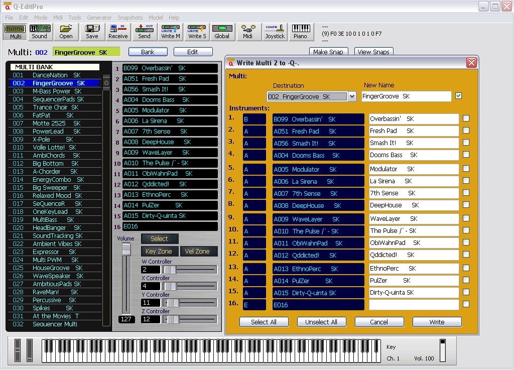 Q-EditPro version 5.0.0 is not a simple update to the previous versions of Q-EditPro editor. It is a completely redesigned program with greatly improved user interface and intuitive functions. We made a great deal of effort to overcome many known problems with Q and microQ sysex-midi engine for you to enjoy the full power of those synthesizers. With a few clicks of mouse you can browse the whole content of the complicated Q engine. Change parameters on fly using controls or even mouse wheel or simply organize your Multies and Sound Banks.