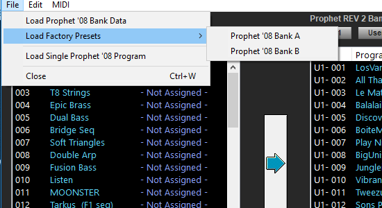 The Prophet ’08 to REV2 Program Converter utility is located under the File menu. This utility converts Prophet ’08 programs to Prophet REV2 programs. Both original Prophet ’08 Factory Preset banks are preloaded for your convenience and if you do not have the Prophet ’08 synthesizer you can now check how these programs sound like.