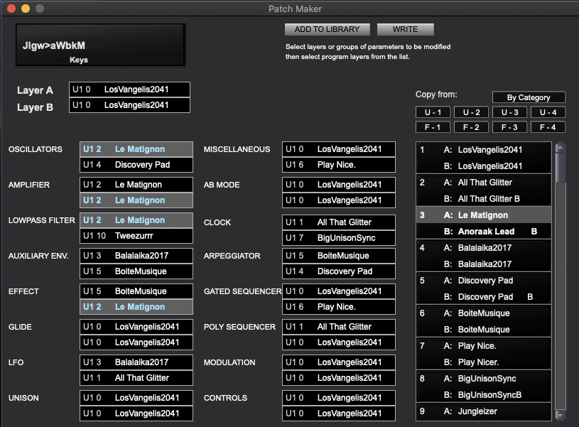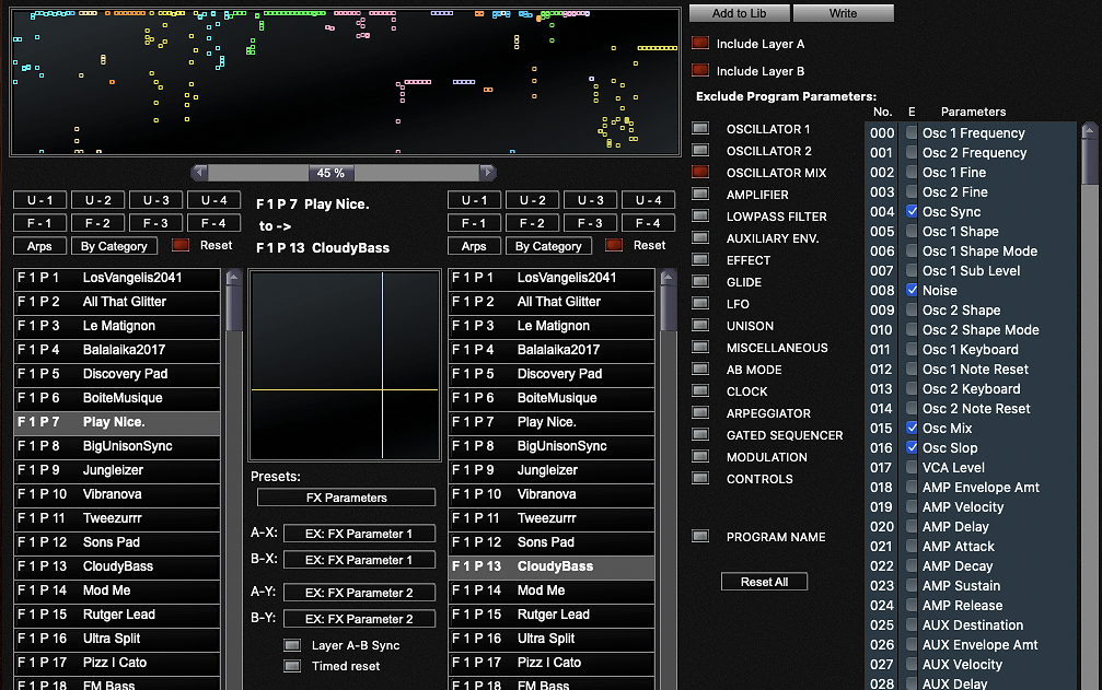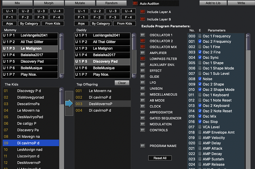 Similarly to the Morph function in the Program Genetic, patches are created by linearly interpolate parameters from a selected program from the list on the left to a selected programs from the list on the right.