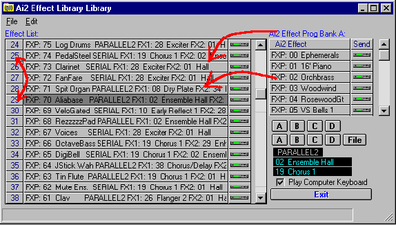 1. Besides a basic function of storing effect settings, the “Effect Librarian” can serve as a very flexible way to quickly copy effects from different sources to current program and combination. This way you can browse through all effects stored with programs or combinations in all banks or files. With one simple mouse click or arrow key they can be applied and audited in the synthesizer's buffer.