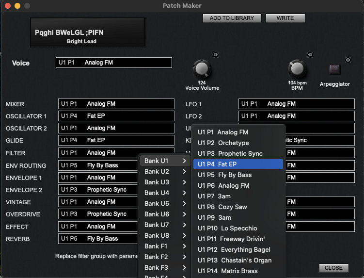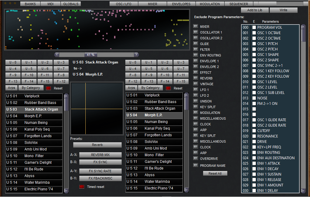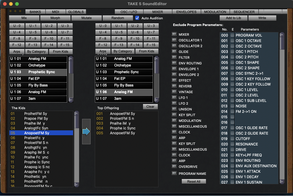 Experimentation using vastly different parents or similar parents creates the most interesting results. You can also ‘interbreed’ the child patches, too. In addition, you can set filters to excluded parameters that will not take a part in the generation of new offspring. Experiment and have fun.