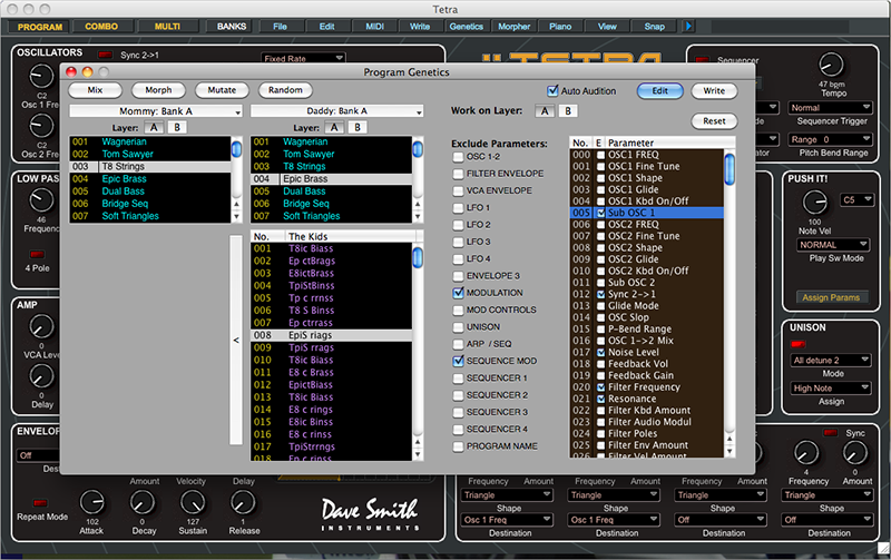 Program Genetics: Create TETR4 Programs using refined algorithms. Functions include "MIX", "MORPH", "MUTATE" and "RANDOM".