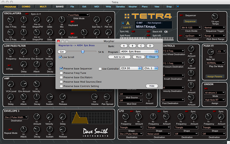 You can blend or “morph” any two TETR4 Programs together to create a hybrid sound having characteristics of both Programs.